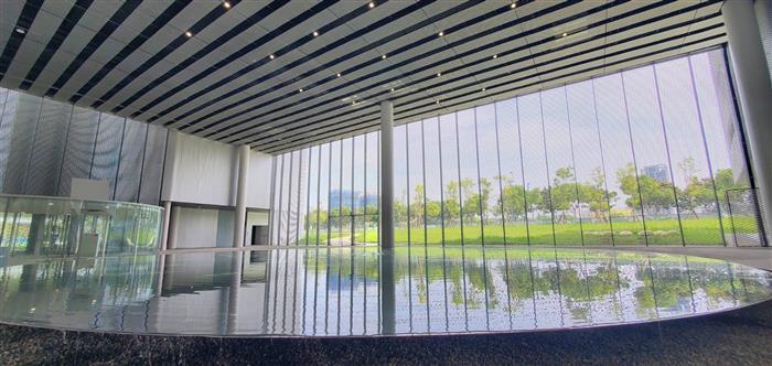此外,由8個大小不一的建築盒子組成的外觀,採擴張網帷幕設計,營造出輕盈且通透的視覺效果,陽光透過金屬網灑入室內,隨著光影變化展現不同層次感,讓建築彷彿與空間融為一體;室內二樓通廊則採「無落柱」設計,使大廳視覺更加寬敞通透,彷彿空間在漂浮。這一切得以實現,全靠導入109座「單擺摩擦隔震器」技術,不僅提升結構安全,也大幅減少鋼構使用量,使建築輕盈如藝術品般懸浮於空間中。