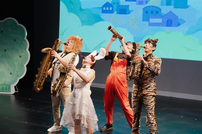 《Do Re Mi 喜咧兜?》由資深編導陳依孝操刀,巧妙結合四把薩克斯風與戲劇表演,讓「音樂跨越語言」成為大小觀眾共享的體驗。故事以迷路的兔子「邦尼」為主角,遇見只會說台語的獅子里歐、老虎泰格與狐狸法克斯,在節奏與旋律的交流中學會傾聽與合作,最終靠音樂找到回家的路。舞台上四位演奏家以高音、中音、次中音與上低音薩克斯風現場演奏,結合角色互動與戲劇情境,不僅讓孩子產生強烈共鳴,也讓親子三代都能一起投入冒險旅程。