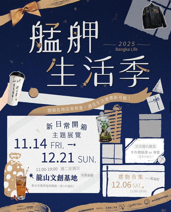 【記者卓羽榛臺北報導】由臺北市政府文化局、龍山文創基地主辦的「2025艋舺生活季」,今年以「新日常開箱」為主題,邀集五間深耕在地的品牌,共同策劃主題展覽與系列活動,並透過「開箱」的形式,重新發現萬華街區裡的小店故事與生活美感。活動自11月14日至12月21日在龍山文創基地登場,包含主題展覽、五堂手作體驗課、限量打卡活動,以及12月6日登場的一日限定「禮物市集」,帶領民眾從茶香、緞帶、古著、植物到午後的小酌,一起探索萬華店家特色及故事與生活日常,以最溫暖的方式陪大家迎接年底節慶。