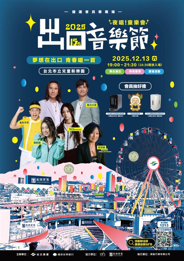 【記者卓羽榛臺北報導】2025出口音樂節,今年首度移師兒童新樂園登場!今年邁入第15屆的出口音樂節,以「夜唱!童樂會」為主題,即將於12月13日晚間在兒童新樂園夜間包場舉辦會員專屬場,活動除精彩演出外,也將開放園區遊樂設施免費暢玩,打造音樂、娛樂與童趣兼具的年度壓軸盛會!11月21日中午12時起,「台北捷運Go」App會員憑10點捷運點,即可兌換限量優先入場券1張;若錯過優先入場券也不要失望,活動當日App會員持綁定電子票證搭乘捷運,並出示搭乘紀錄,即可免費入場,快把這場冬季最療癒的童樂派對收進行事曆。