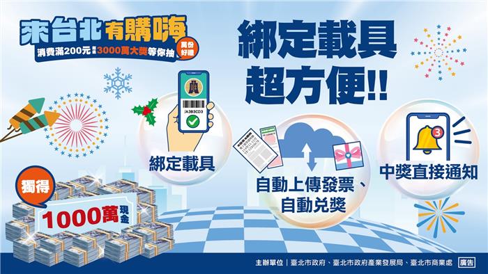 只要在台北市任一店家消費滿 200 元,就是一筆潛在的獲利機會,前往「友好特店」消費,機會更是直接加倍!別讓手中的發票變成廢紙,快上網註冊並綁定載具,下一個台積電股東或是抱走千萬獎金的幸運兒,可能就是你!更多活動詳情請上「來台北有購嗨 消費歡樂抽」活動網站及「台北市商業處-我是商Ya人」粉絲團查詢)。