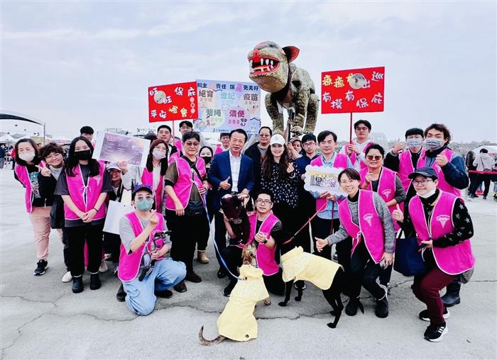 在熱鬧璀璨的2026台灣燈會現場,嘉義縣家畜疾病防治所(嘉畜所)結合三昧堂精心製作「獵狗公」寵物神,與兩隻來自「浪浪就業服務站」訓練小狗,共同辦理一場萌力十足動保創意宣導小遊行,推廣「飼主五大責任」。