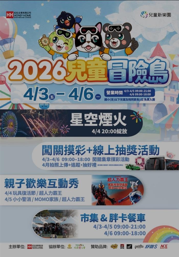【記者卓羽榛臺北報導】為迎接一年一度的兒童節,兒童新樂園推出多項優惠措施及主題活動,打造充滿童趣的「兒童月」氛圍。4月3日至6日連假期間,凡國小(含)以下兒童持健保卡等證明文件,即可與1位陪同家長免費入園;4月4日兒童節當日晚間並將施放40秒星空煙火秀,園區內同步規劃「玩具復活節」、「小小警消體驗」等系列主題活動,邀請全國大小朋友共度歡樂假期。