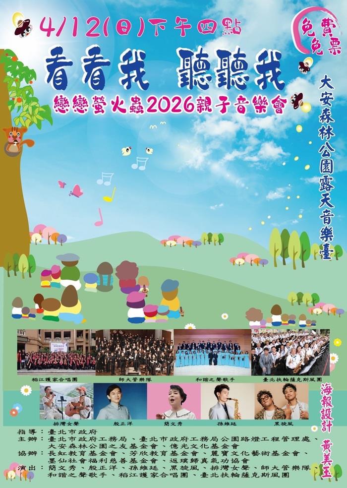 (記者謝政儒綜合報導)看螢火蟲一定要翻山越嶺嗎?今年4月臺北市政府的螢火蟲季即將開跑,在各界努力下,成功讓點點螢光重現都市綠洲。臺北市政府工務局暨公園路燈工程管理處、大安森林公園之友基金會及億光文化基金會將於4/12(週日)下午4點在大安森林公園舉辦「看看我 聽聽我」親子音樂會,為大家帶來舒心的春暖午後。
