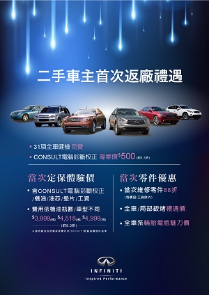 INFINITI 二手車主首次返廠禮遇專案 享免費健檢及當次定保體驗價3,999 元起