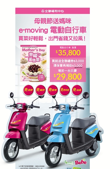(記者黃秀麗臺北報導)中華電動二輪車首度攜手合作全聯福利中心開賣e-moving Bobe電動自行車...