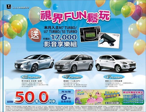 購買LUXGEN M7、U7、S5 TURBO享50萬高期數0利率 贈影音享樂組