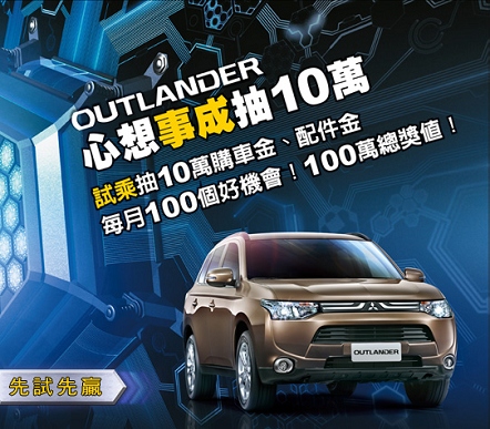 試乘OUTLANDER抽10萬購車金 共有100個機會