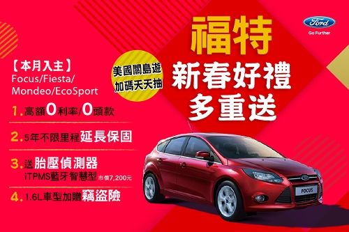 (記者黃秀麗臺北報導)福特新春好禮多重送,好康加碼天天抽獎NT$20,000元關島旅遊基金,即日起至...
