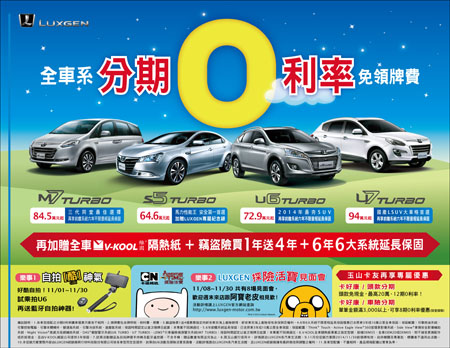 (記者黃秀麗臺北報導)LUXGEN體貼準車主,年底加碼推出「慧眼獨具」入主專案,本月份全車系0利率以...