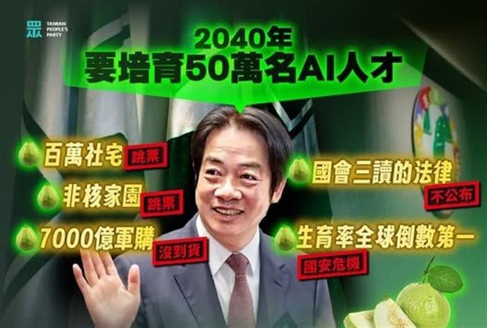(記者黃啟明台北報導)台灣民眾黨痛批賴總統就是能臉不紅、氣不喘,繼續對全民開出芭樂票;百萬社宅跳票,沒關係;非核家園跳票,沒關係;七七四十九項政見瘋狂跳票,通通都沒關係,這次最新力作,叫做「2040 年要培育 50 萬名 AI 人才。」