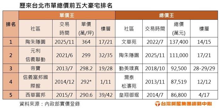 【記者柯安聰台北報導】台灣豪宅單價刷新史上最高價紀錄!已完工7年的「陶朱隱園」,終於實價揭露,去年11月17樓交易總價11.1億元、單價364萬元,成為台灣豪宅單價王,總價則僅次於2022年「文華苑」13.74億元的交易,為豪宅總價亞軍。