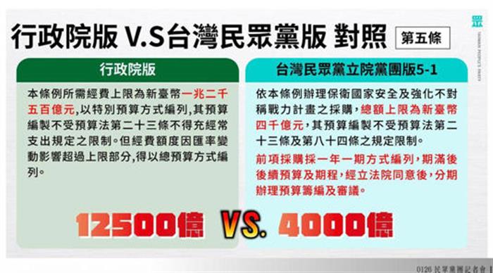 | 國防條例 民眾黨提新版 1.25兆元VS.台幣4000億元 |