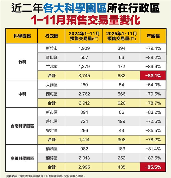 【記者柯安聰台北報導】有科學園區坐落的行政區常吸引人口、產業的移入,帶動過去房市熱絡,不過2025年出現變化。永慶房產集團統計2025年1-11月各大科學園區預售屋的交易量,發現各園區預售屋量縮幅度顯著,竹科、高雄園區年減達8成以上,中科和台南園區也超過7成5,顯示儘管有園區的利多題材加持,這些行政區的交易量仍呈迅速量縮。