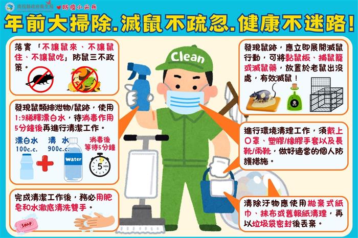 【記者林玉芬南投報導】農曆春節將至,南投衛生局提醒民眾,大掃除時落實防鼠三不原則,「不讓鼠來、不讓鼠住、不讓鼠吃」。若發現鼠類排泄物,應佩戴口罩、手套,以稀釋漂白水(100cc市售漂白水+1公升清水)潑灑消毒30分鐘後,再以拋棄式紙巾清理,避免病毒隨空氣揚起。