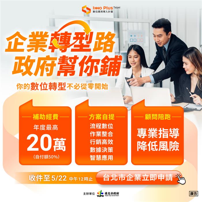 【記者卓羽榛臺北報導】隨著數位應用快速發展,企業導入工具並落實應用,已成為提升營運效率與競爭力之關鍵。為協助企業突破轉型困境,臺北市政府產業發展局持續推動「臺北市中小企業數位轉型導入計畫」,提供最高新臺幣20萬元輔導經費,結合顧問陪跑機制,協助企業加速數位應用落地。今年亦特別針對受美國關稅政策影響企業,提供10家保障名額,強化企業營運調整能力,歡迎本市企業踴躍提案。