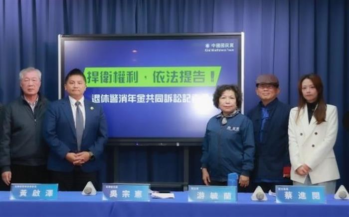 國民黨上午召開「捍衛權利,依法提告!退休警消年金共同訴訟」記者會,文傳會主委吳宗憲、前立委游毓蘭、國民黨發言人江怡臻、全國退警總會榮譽總會長耿繼文、全國退警總會總會長黃啟澤、前分局長蔡進閱及律師蔣宗佑等共同出席。