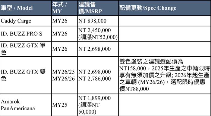 | 台灣福斯商旅車型年式更新與建議售價調整 |