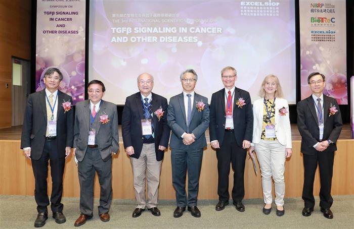 (圖)科懋生技6日舉辦第三屆乙型轉化生長因子國際學術研討會,由董事長陳澤民(左3)邀請中研院院長廖俊智(左4)與會致詞,講者包括諾貝爾基金會主席Carl-Henrik Heldin(右3)、瑞典知名學者Paraskevi Heldin(右2)、美國聖路易大學教授黃榮三(左2)、臺大醫院癌醫分院院長楊志新(左1)和中央研究院生醫轉譯研究中心主任吳漢忠(右1)等人。