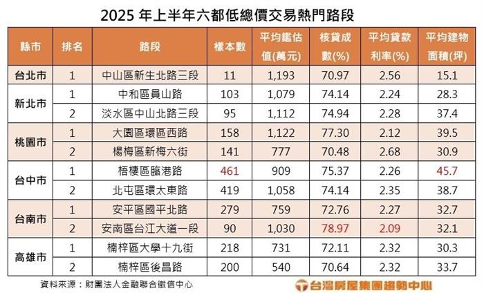 至於雙北市場,張菱育指出,台北市因房價水位高,所以僅中山區新生北路三段入榜,平均鑑估值1193萬元,但平均建物面積只有15.1坪,反映首都的低總價市場依賴套房小宅撐場。新北市則分別由中和區員山路1079萬元、淡水區中山北路三段1112萬元入榜,除了新案交屋潮之外,還有屋齡40年上下的老公寓交易,相對台北而言更具CP值,成為雙北首購族關注的焦點。(自立電子報2025/9/15)