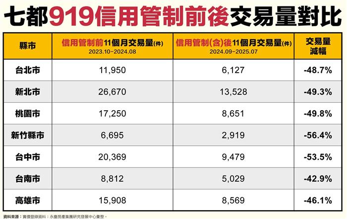 【記者柯安聰台北報導】自去年9月19日第七波信用管制措施上路以來,房市風向明顯轉變,原本熱絡的市場迅速降溫。適逢政策實施即將屆滿1年,永慶房產集團根據最新的實價登錄資料,比較政策前後各11個月的交易量。數據顯示,與信用管制前相比,受到第七波信用管制後,七都交易量大幅下滑,皆有4成以上減幅,並以台中、新竹量縮情況最為明顯。