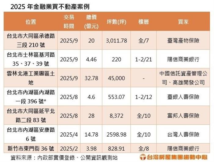 第一建經研究中心副理張菱育指出,保險業購置不動產,多以商辦大樓、收益型資產與地上權等標的為主,且依照規範,不得以借款方式購置,必須全額以自有資金支付,因此保險業的買盤相對穩健,目標多鎖定具長期保值性的資產。相較之下,銀行業購置不動產則以自用型需求為主,例如分行據點或企業總部,因此標的偏向地段佳、交通便利的商辦或店面,兼具企業形象與實用功能。