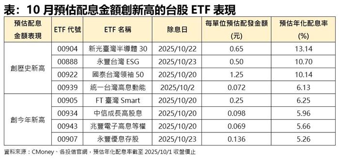 從預估年化配息率來看,新光00904年化配息率預估達13.14%,摘下同類型表現最佳;永豐00888、國泰00922也預估有10.70%、10.14%,創兩位數以上的年化表現;至於FT臺灣Smart、中信成長高股息、兆豐電子高息等權以及永豐優息存股等4檔除息ETF,10月預估配息金額也都創今年以來最佳,預料也將吸引市場買盤關注,帶動台股ETF除息吸金熱潮再現。