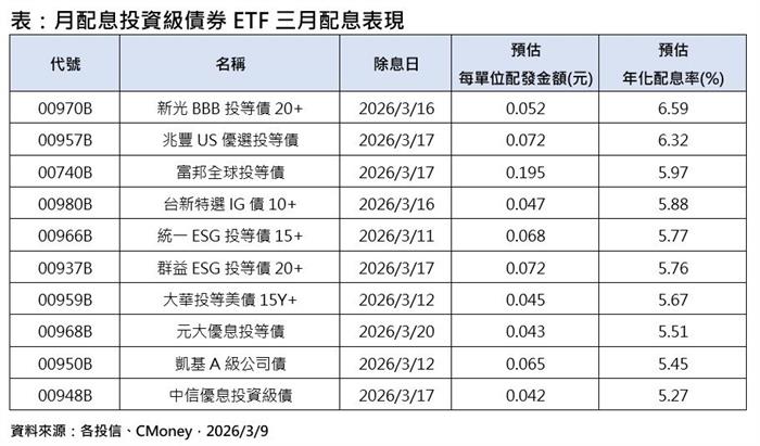 根據CMoney統計,3月展開除息的債券ETF共46檔,預計下周起,將有19檔債券ETF密集除息,其中,新光BBB投等債20+(00970B)、兆豐US優選投等債(00957B)2檔訴求月配息,預估年化配息率突破6%以上、將於下周一、周二展開除息;其他如富邦全球投等債(00740B)、台新特選IG債10+(00980B)、群益ESG投等債20+(00937B)及元大優息投等債(00968B)等4檔,同步下周啟動除息,預估年化配息率也逾5.5%以上。