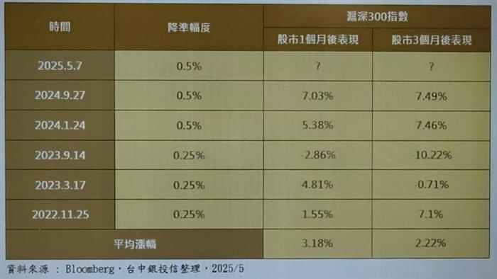 台中銀投信研究團隊指出,降準降息為中國人行維穩經濟的常用工具。從近幾次歷史數據中觀察,每每政策發布後,對於中國股市短期內多半都有提振效果。從前5次降準經驗觀察,宣布後1個月、3個月平均漲幅各達3.18%、2.22%,顯示短期內確有激勵效果。此外,降準次數從2018年的4次,2019-2020年降為3次,2021年以後都降為2次,顯示經濟逐步打底接近尾聲,正從過去刺激房地產的模式,轉型成內需及科技並進的發展模式。