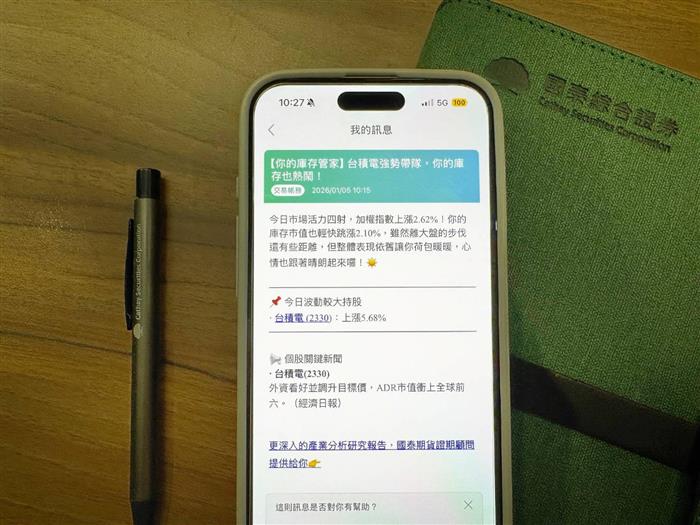 【記者柯安聰台北報導】2025年台股市場交投火熱,全年集中市場總成交金額高達101.79兆元,首度突破百兆元大關,成功寫下歷史新高紀錄。投資人每日須面對龐大盤勢與個股消息,對於忙碌的上班族而言,難以在盤中即時掌握市場動態,可能因此錯失與自身持股相關的市場訊息。國泰證券為協助客戶有效管理投資,領先業界首創「庫存管家」服務,以客戶持股為核心,應用AI技術打造個人化推播服務,協助投資人更有效率地掌握庫存狀況,提供更即時、系統化的投資管理體驗。
