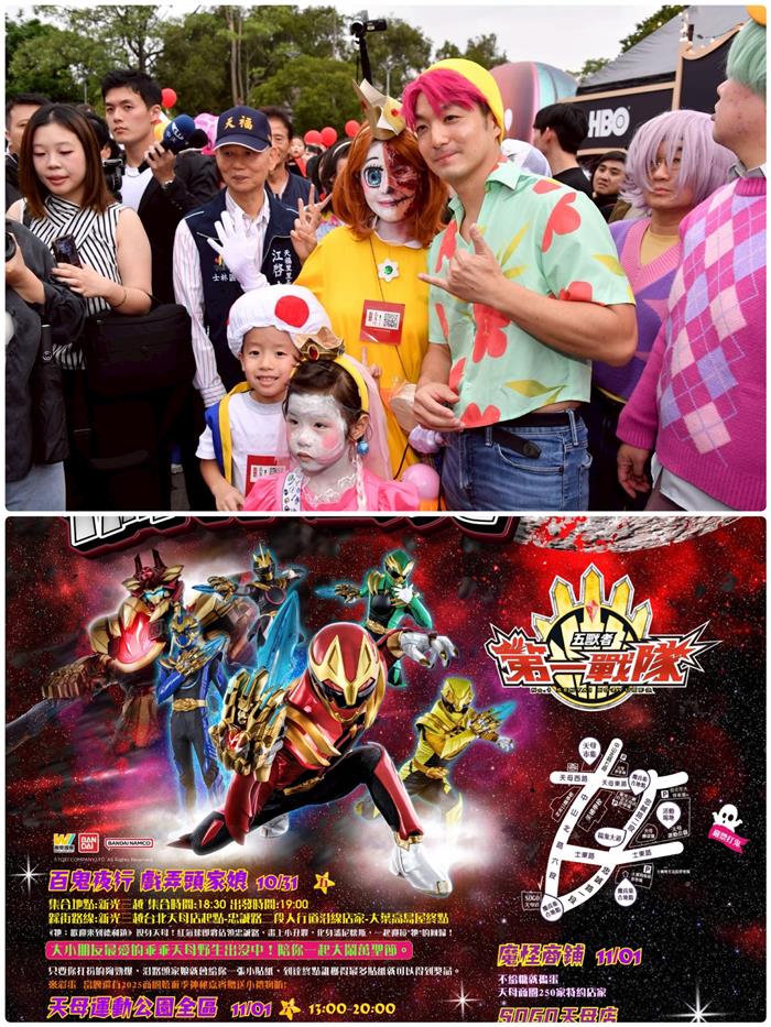 由臺北市商業處輔導台北市天母商圈發展協會辦理的天母搞什麼鬼17 萬聖節嘉年華活動現場人潮爆滿、氣氛熱烈,大小朋友變裝互動、逛市集 拿好禮,盡情投入這場全民搞鬼的節慶派對。今年更首度攜手HBO Max合 作,打造原創影集《牠:歡迎來到德利鎮》沉浸式恐怖展區,重現60年代 詭譎小鎮風格,巨型紅氣球與潘尼懷斯本尊驚喜現身,成為最吸睛的打卡 熱點。更集結「第一戰隊五獸者」、「超人力霸王奧米加」、「假面騎士 ZEZTZ」、「乖乖」及「Dragon Beauties」等現場互動等人氣角色,趣味 十足的「滿天星奇幻魔法大冒險」、「萬聖節泡泡擂台挑戰賽」等活動與貝 丹秘密市集,聯手炒熱天母萬聖週末,全齡嗨玩、熱鬧爆棚!