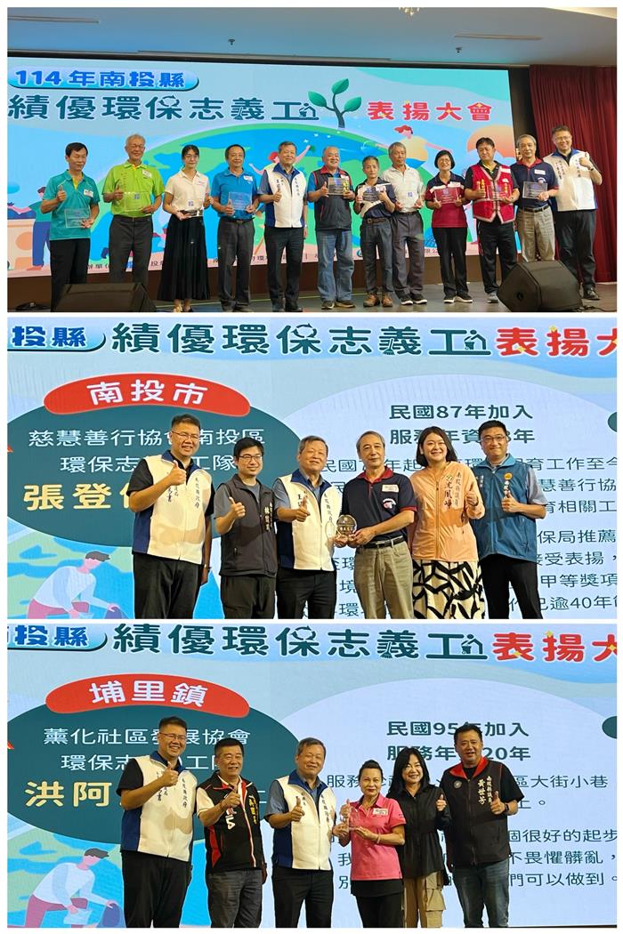 【記者林玉芬南投報導】感謝環保志義工長期在環境保護工作上的無私奉獻與卓越貢獻,縣府13日在南島婚宴會館舉辦「114年南投縣績優環保志(義)工表揚大會」,副縣長王瑞德頒獎表揚543位績優環保志義工及10支特優志工隊。