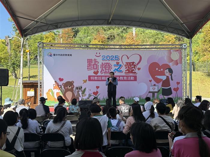 【記者陳世長台中報導】台中市政府教育局(14)日在南投縣九九峰動物樂園熱鬧展開「點燈之愛特教班親師生戶外教育活動」,活動邀請台中市國中小集中式特教班學生、教師、家長及教助員等約計1,000人共同參與,讓孩子們走出教室、親近自然,在動物世界中探索學習,享受一場寓教於樂的戶外教育體驗。教育局郭副局長致詞。