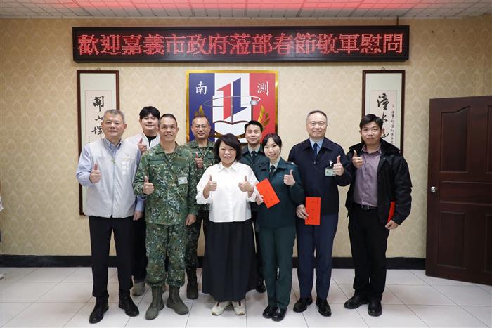 為感謝國軍辛勞,嘉義市黃敏惠市長(19)日率領市府團隊及嘉義市工業會、嘉義市商業會、嘉義市職業總工會、嘉義市總工會、嘉義市婦女會、嘉義市青溪總會、嘉義市青溪婦女協會、嘉義市女子美容商業同業公會、嘉義市崇她社、嘉義市中華眷村文化發展協會與嘉義縣市軍人服務站等社會各界代表,前往陸軍南部測考中心舉辦春節勞軍活動。